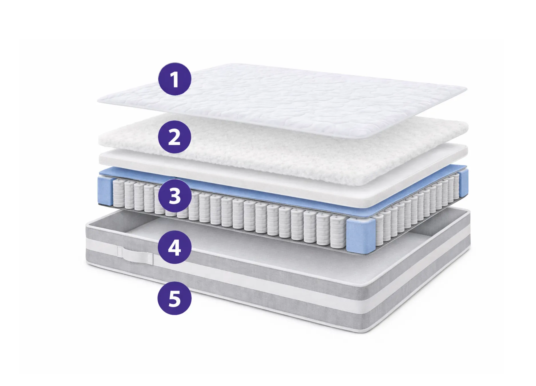 La struttura interna è composta da un nucleo di molle racchiuso in un box perimetrale in Tecnosoft HD, una resina ad alta densità che rinforza i bordi e migliora la stabilità complessiva. Il rivestimento esterno è in poliestere antibatterico con imbottitura che varia tra lato estivo e lato invernale, così da favorire un microclima confortevole.